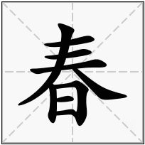 (1) (会意。甲骨文字形,从草(木),草木春时生长;中间是“屯”字,似草木破土而出,土上臃肿部分,即刚破土的胚芽形,表示春季万木生长;“屯”亦兼作声符。小篆字形,隶变以后,除“日”之外,其他部分都看不出来了。本义:春。四季的第一季)