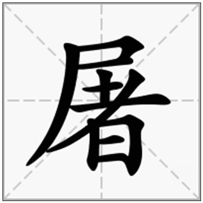 屠(Tú),简体部首:尸,部外笔画:8,总笔画:11。繁体部首:尸,部外笔画:9,总笔画:12。