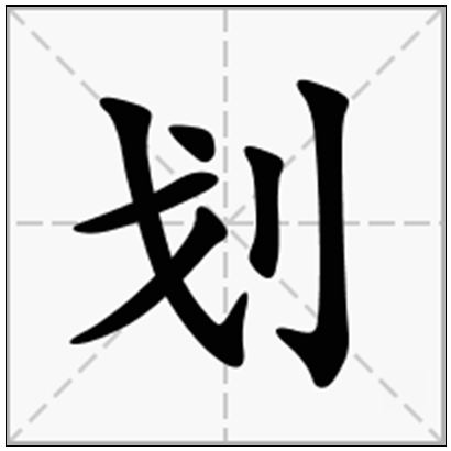 划,左右结构会意;从刂、从戈。用尖利物把东西割开。如:划上消息(闩上扣键);划玻璃;手上划了一个口子。拨水前进,桨拨水使船前进 [paddle;row]。如:划行(拨桨行船);划船运动水上运动之一。