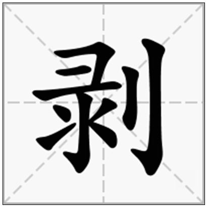 剥:(1)bāo(口语),去掉外面的皮或壳,如”剥花生“”剥皮“;(2)bō(书面语),用于合成词或成语,如”剥削“”剥夺“”剥落“”生吞活剥“。剥,制理。字义源于《周易》剥卦卦象。卦象上九位居五阴爻之上,有统制五阴之象,卦辞讲:“剥,不利有攸往。”剥的本义是以刀砍物而致物裂。从卦形看,上九之下的五阴有中间开裂之象,生活中最常见的用斧头劈木头一样,斧子劈上头一点,即可顺其丝纹裂至于下,由此可以总结出以点带面的管理思想。