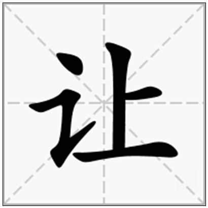 让,从言从襄,以语言相互扣合。不争,尽(jǐn)着旁人,忍让:~步。~位。谦~。2. 请:~茶。3.许:不~他来。4. 任凭:~他闹去。5. 被:~雨淋了。6. 索取一定代价,把东西给人:出~。转(zhuǎn )~。7. 闪避:~开。当仁不~。8. 责备,谴责:“二世使人~章邯”。9. 古同“攘”,侵夺。