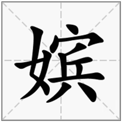 嫔,古代妇女的统称,本义为帝王的女儿出嫁,亦是对妇人的美称,如:嫔妇(国中妇人有德行者);嫔德(妇德);嫔俪(指妻);嫔则(为妇的准则);嫔息(妻与子女)。历史上有八嫔临御,指“僖嫔、端嫔、穆嫔、熙嫔、道嫔、通嫔、襄嫔、静嫔”。