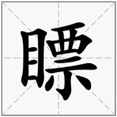 瞟 形声。字从目从票,票亦声。“票”意为“掠过”、“轻拂”。“目”与“票”联合起来表示“目光轻快地扫过”。本义:扫人一眼。