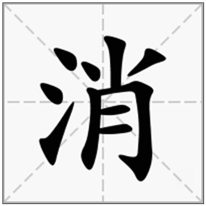 汉字,意义:1.溶化,散失:烟~云散。~融(亦作“消溶”)。~失。~逝。~亡。~沉。~极。~化。2.灭掉,除去:~除。~灭。~毒。~炎。3.把时间度过去:~夜。~夏。~闲。~遣。~磨(mó)。4.减少,损失,耗费:~耗。~损。~退。5.需要:不~说。6.中医学病名:~疾。~渴。