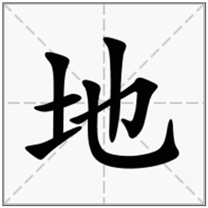 地,dì,从土从也。也,本义女侌。元气初分,轻清阳为天,重浊阴为地。原为古汉语名词,与天相对,本意为物质,后逐渐引申为土地、大地、地表。(见《道德经》“天长,地久。天地之所以能长且久者,以其不自生也,故能长生。”,“地久”即“物质长久不变”)地有两个读音:dì、de。可以用在动词后作助词,也可以作为名词,表示大地(指地球表面最下方;贴近地壳的表面部分),地球等。