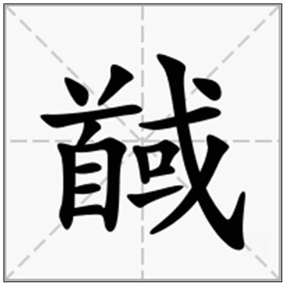 馘 “guó”与“xù”,(因“xù”极少用,一般字典无“xù”音,《康熙字典》中有所记述) 形声。字从首,从或(huò),或亦声。“或”义为“边境巡逻时偶然遇到敌情”。“首”指“首级”。“首”与“或”联合起来表示“在一次边境巡逻时偶然碰到来犯之敌,将其执杀并割其头颅”。本义:边防军取得的敌人首级。